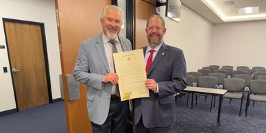 Senator Frank Carroll presents ASA Executive Director, Ross B Garelick Bell, with the Senate Proclamation declaring January 29, 2025 Arizona Aerospace Day 2025